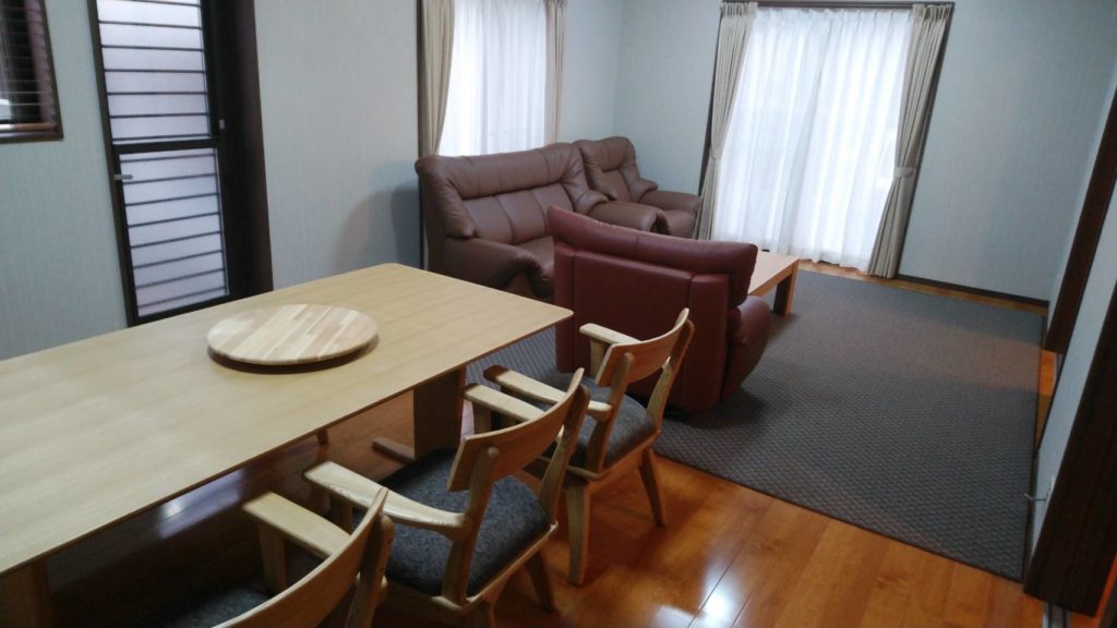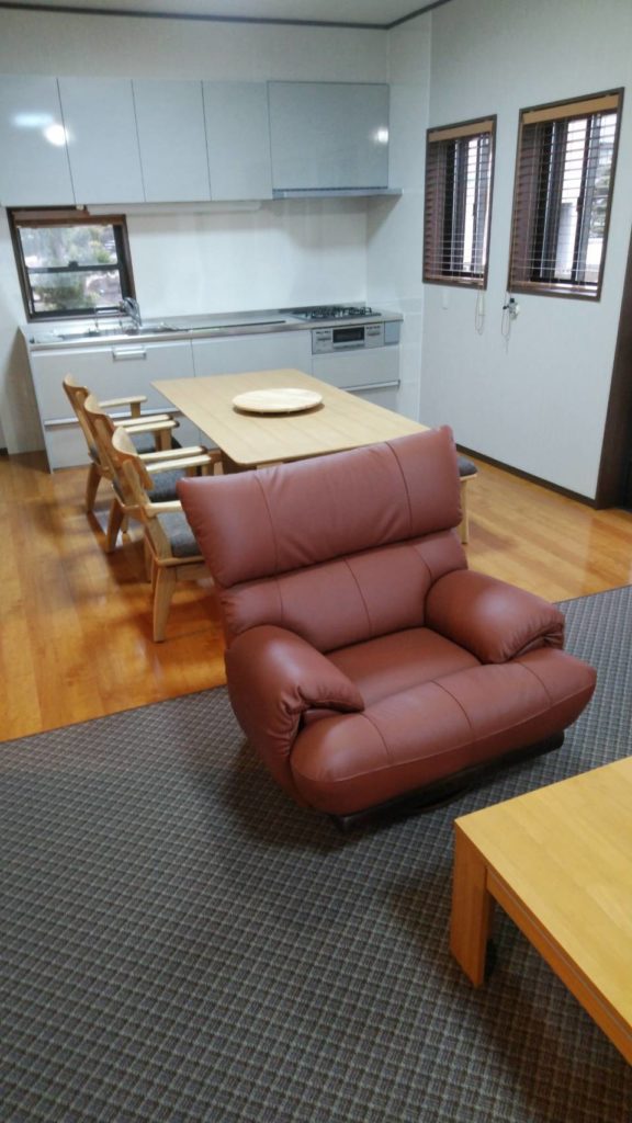 ソファ―3人掛けと、一人掛けソファー革張りで一人掛けソファ-1本は回転式です。