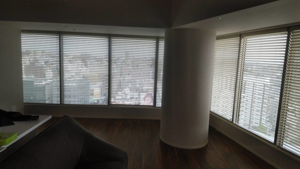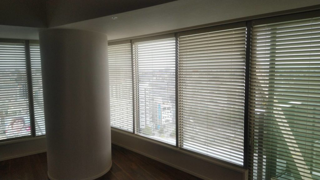 ガラス張りの角部屋には、ウッドブラインドで仕上げました。強い日差しが差し込む部屋ですが、羽の開閉で自由に調光できます。