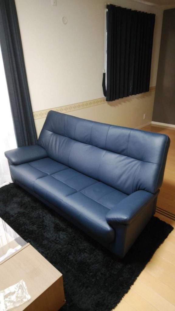 3人掛けの国産革のソファーです。ハイバックの背もたれで、かけ心地の良いソファーです。