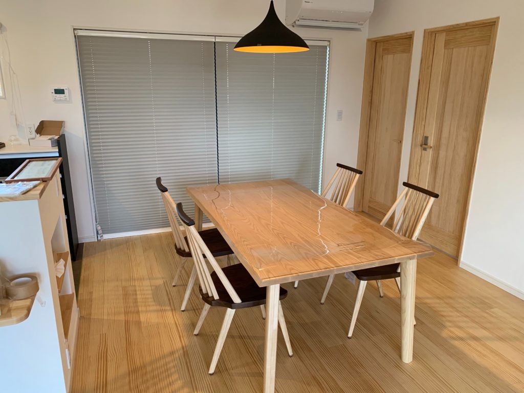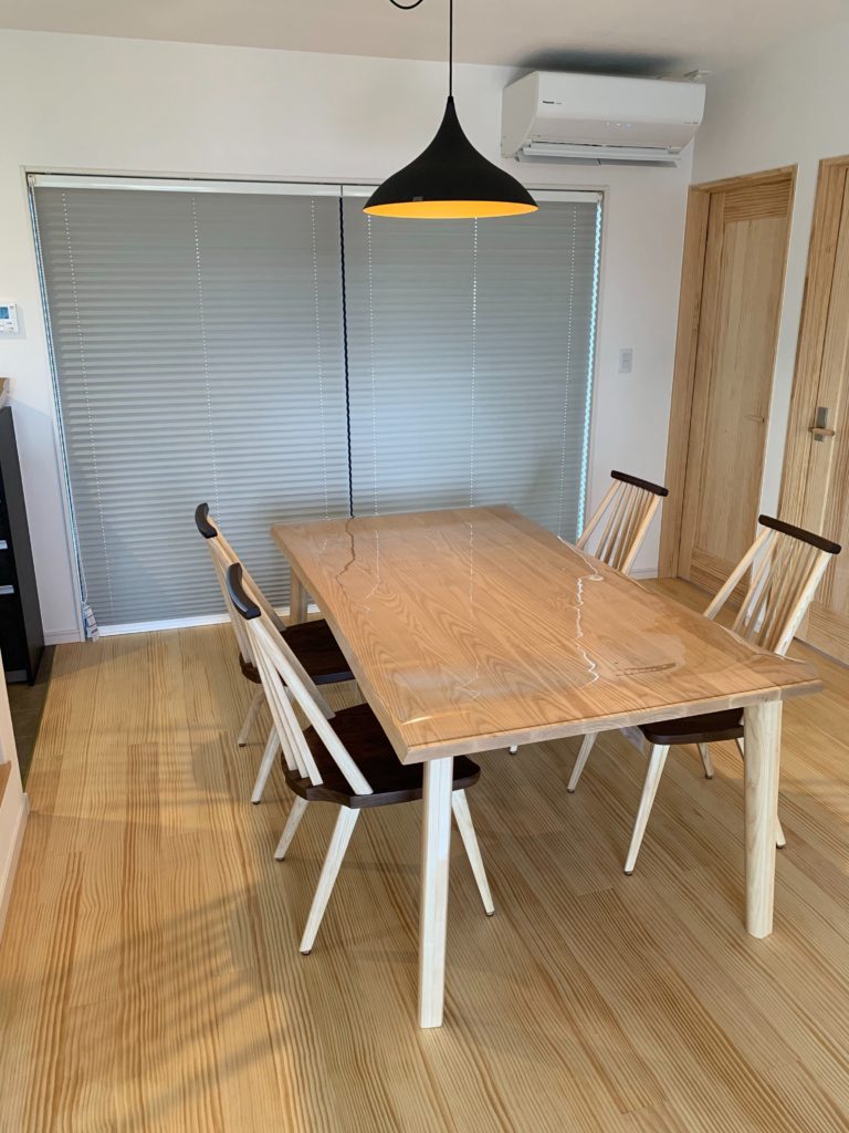 S様はこの食卓セットをすごく気にいられていたようで、何度も見に来られていました。ウォールナットとアッシュ材の無垢材使用です。180CMテーブルで椅子4脚とゆっくりお座りいただけます。